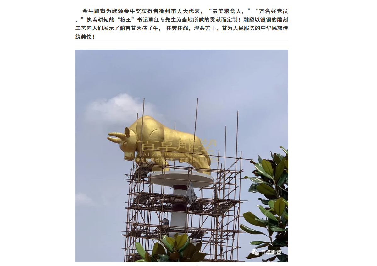 金牛雕塑為歌頌金牛獎獲得者衢州市人大代表,“最美糧食人,”“萬名好黨員 ,”執(zhí)著耕耘的“糧王”書記董紅專先生為當?shù)厮龅呢暙I而定制!雕塑以鍛銅的雕刻工藝向人們展示了俯首甘為孺子牛, 任勞任怨,埋頭苦干,甘為人民服務(wù)的中華民族傳統(tǒng)美德!